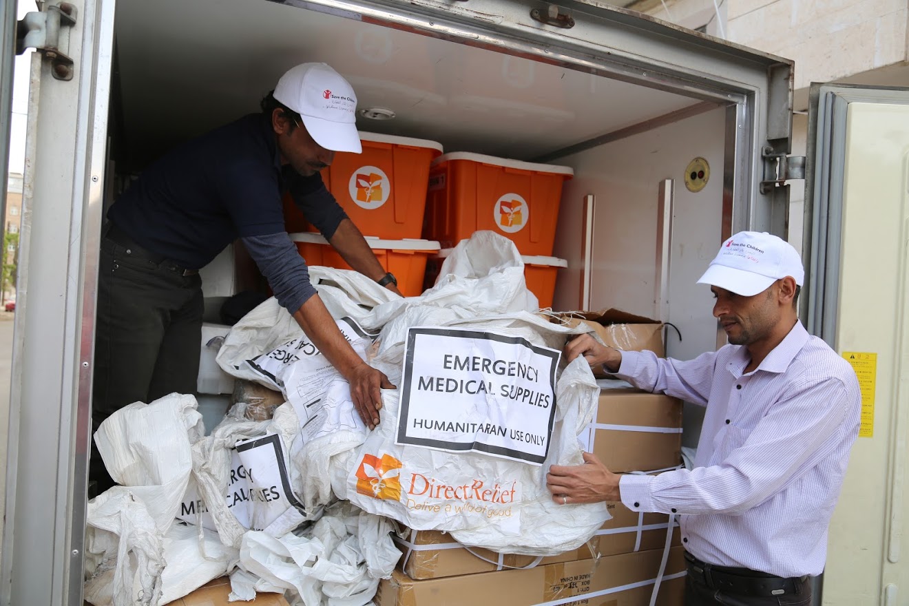 An Emergency Health Kit arrives in Yemen in August 2017. Direct Relief shipped two Cholera Treatment Kits and an Emergency Health Kit to hospitals in Hodeidah, Sana'a and Hajjah with the coordination of Save the Children Yemen. (Photo courtesy of Save the Children Yemen)